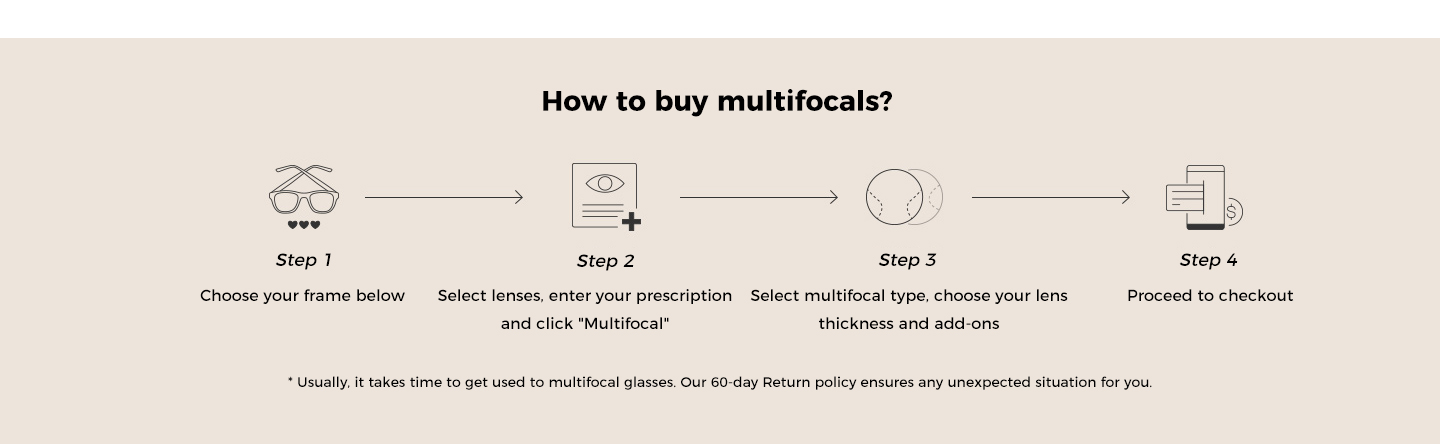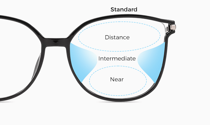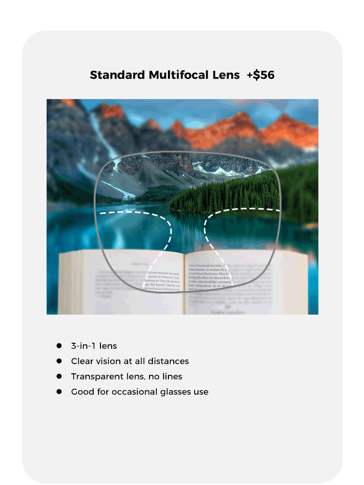 Firmoo offers two types of multifocal lenses: Standard Multifocal lenses and Advanced Multifocal lenses. Both types provide the solution for seeing at all distances - far, intermediate, and near.