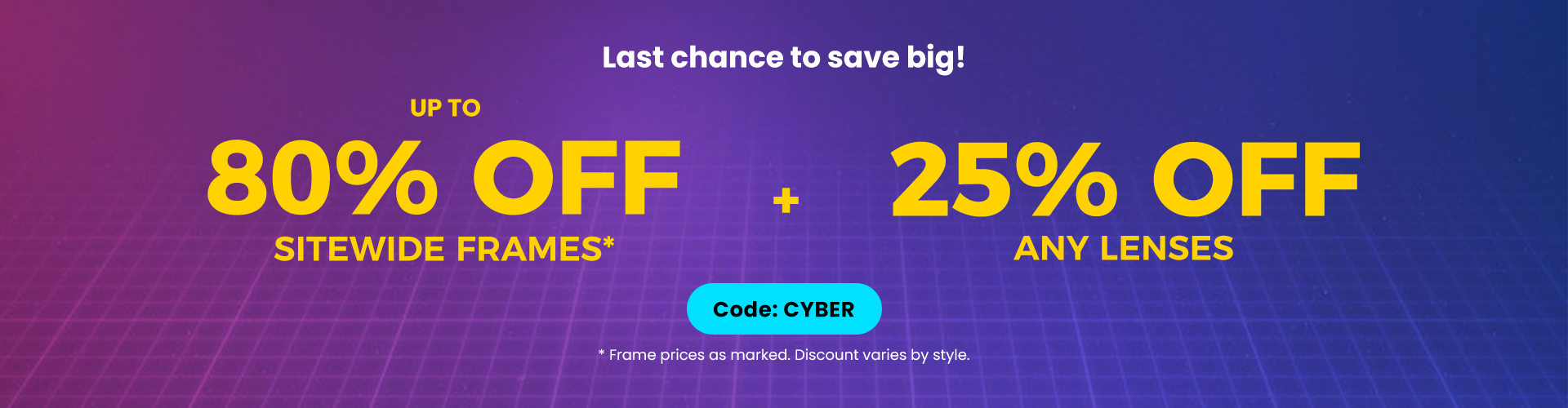 Frame price are already marked down. Apply code CYBER for extra 25% off lenses.